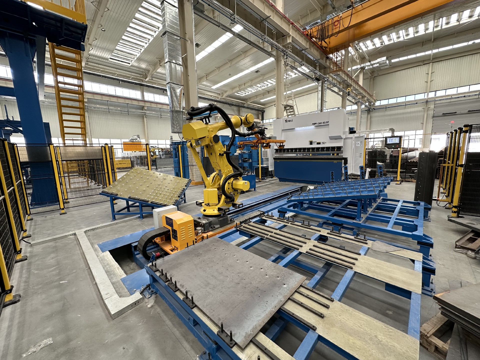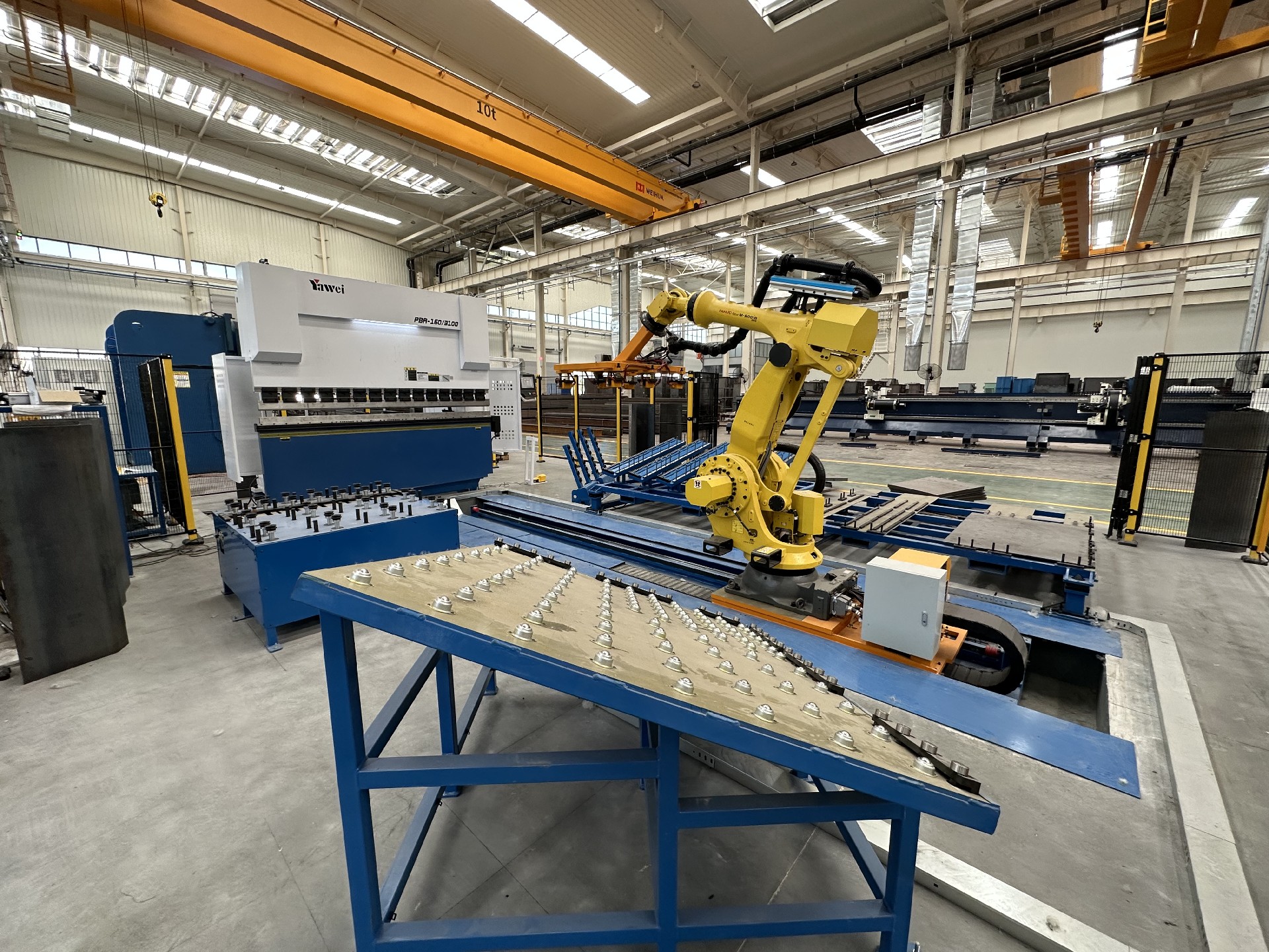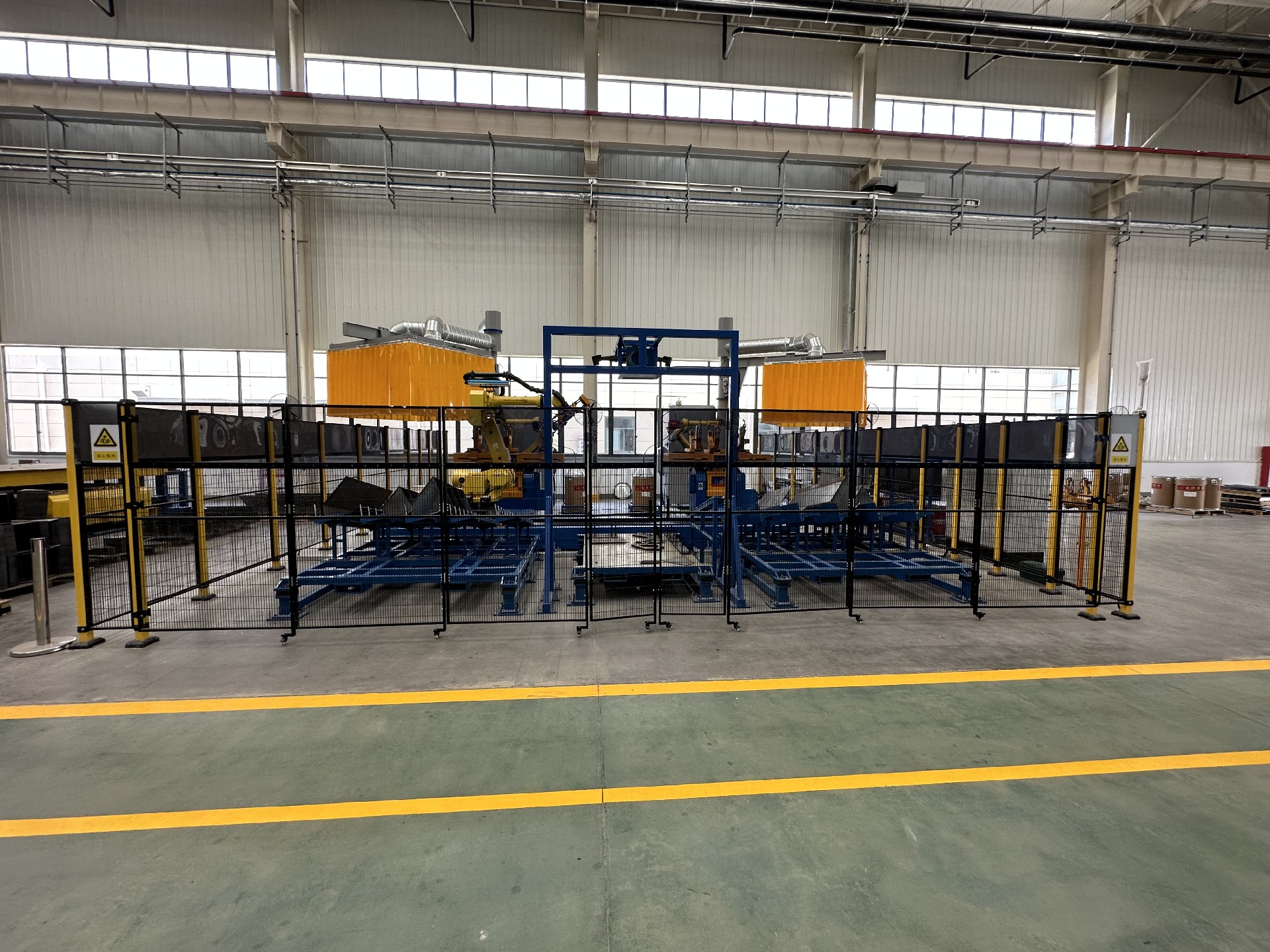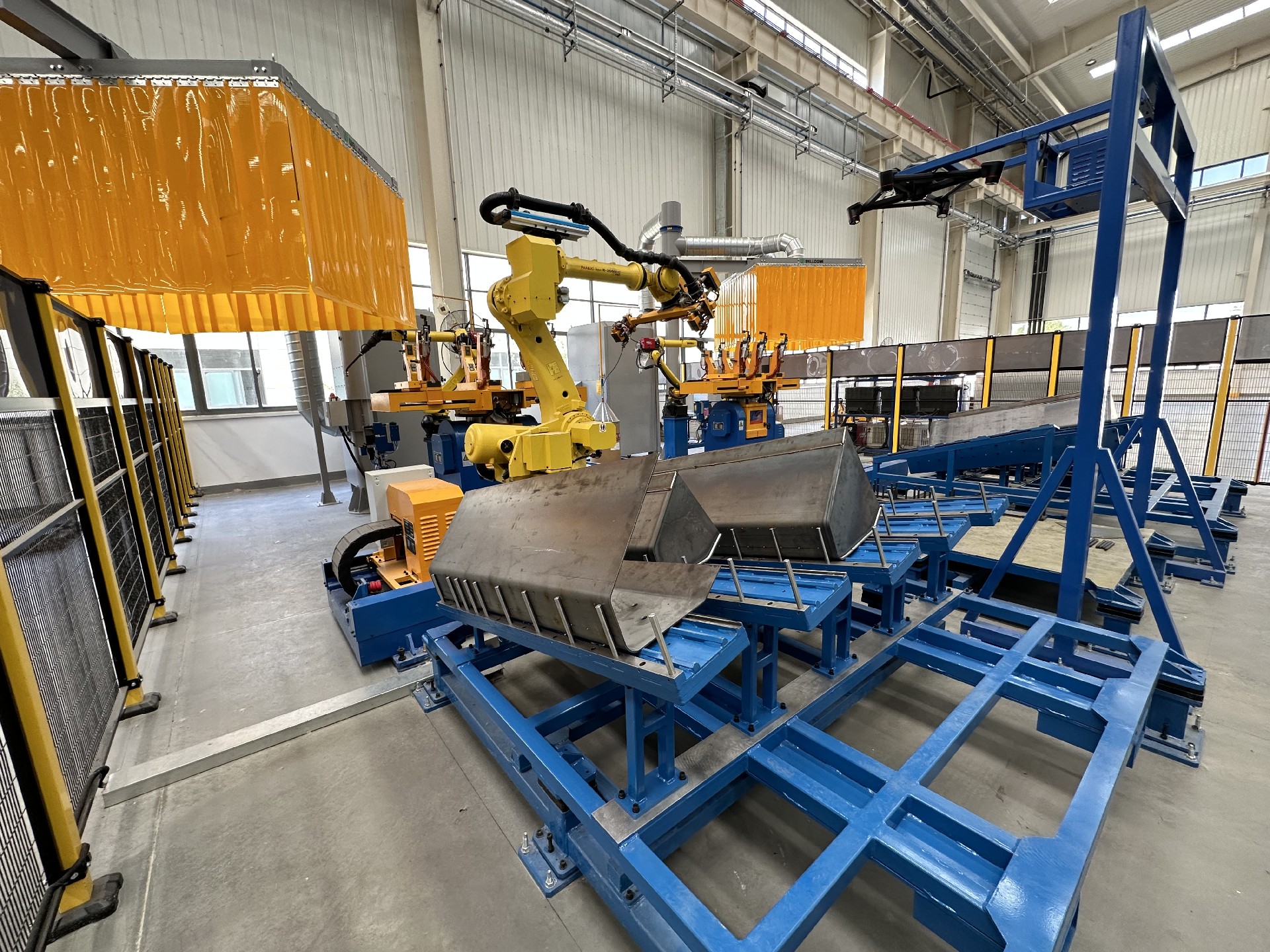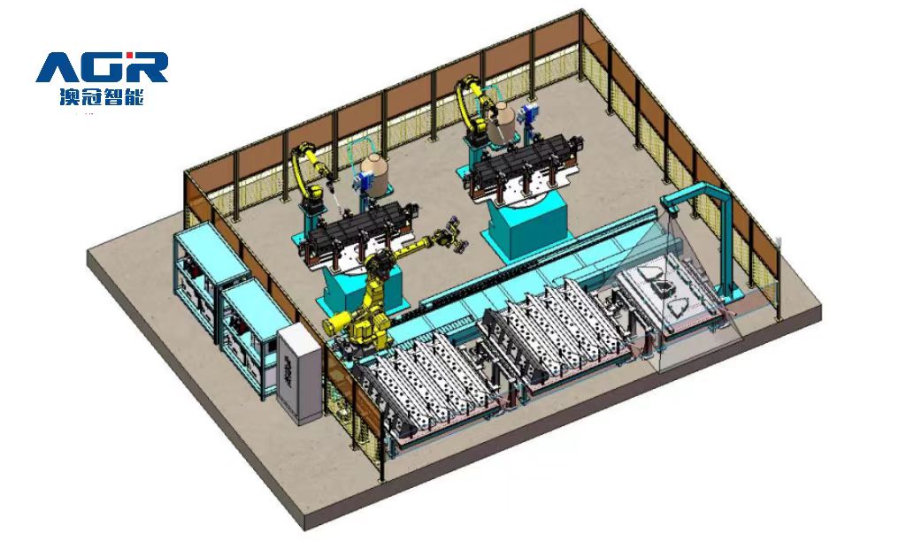 整體布局:工作站配備 2 臺(tái)發(fā)那科焊接機(jī)器人、1 臺(tái)發(fā)那科搬運(yùn)機(jī)器人、2套兩軸變位機(jī)、4 套組對(duì)工裝、1 套搬運(yùn)機(jī)器人地軌、1 套抓手、2 套旋轉(zhuǎn)立柱除塵系統(tǒng)、1 套視覺系統(tǒng)、1 套電氣系統(tǒng)及對(duì)應(yīng)輔助設(shè)備。