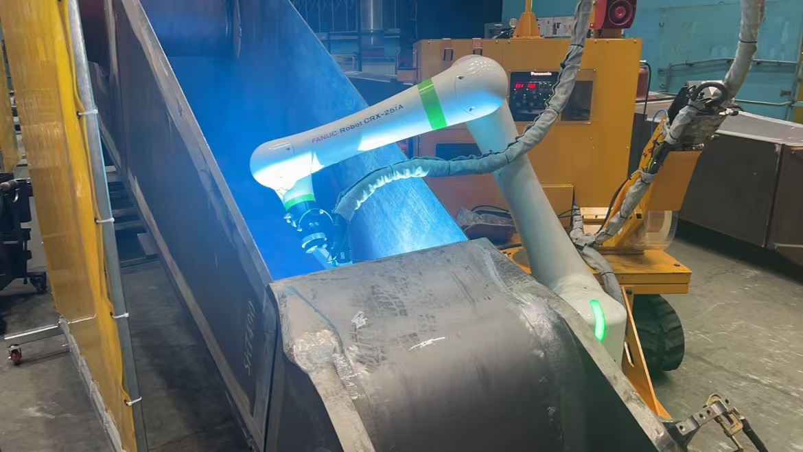 基座邊梁機(jī)器人工作站主要由一臺(tái)履帶底盤、一臺(tái)發(fā)那科CRX-25iA機(jī)器人、一套松下焊接設(shè)備、以及其余周邊設(shè)備構(gòu)成。